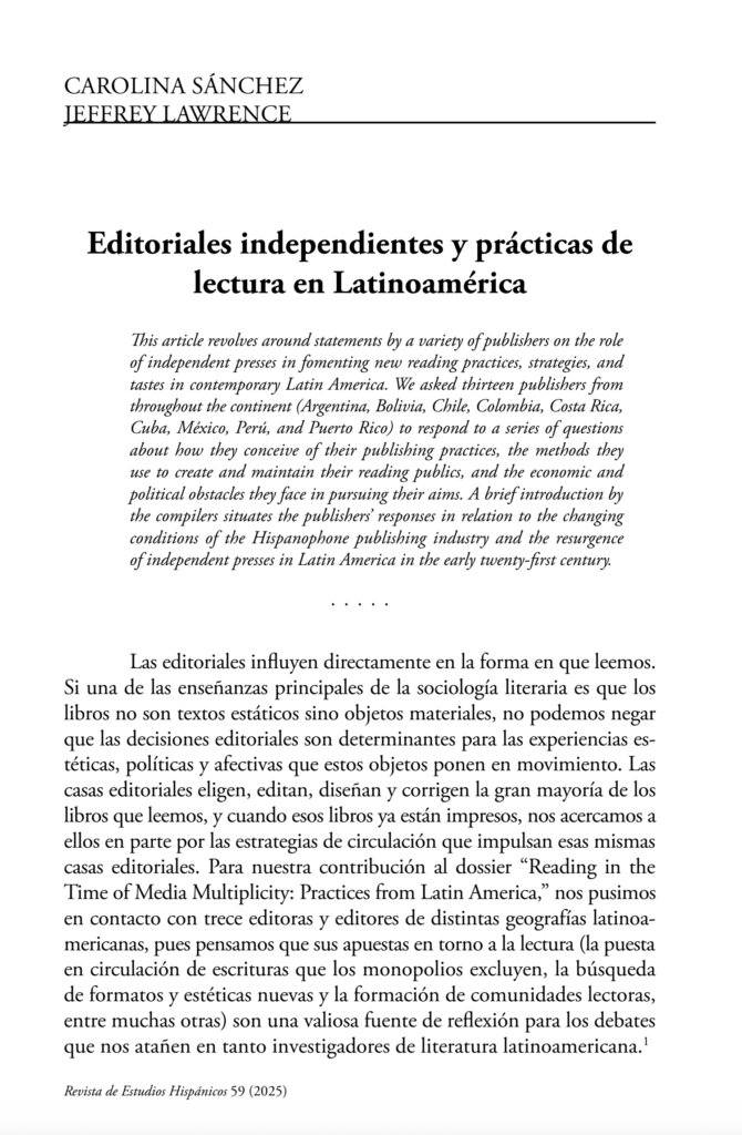 Compartimos un ensayo de les colegas Carolina Sánchez y Jeffrey Lawrence, publicado en el número más reciente de la Revista de Estudios Hispánicos. Este texto recoge múltiples testimonios, experiencias y reflexiones de editoriales independientes alrededor de América Latina y el Caribe, y nuestro proyecto editorial caborrojeño fue incluido. ¡Gracias!