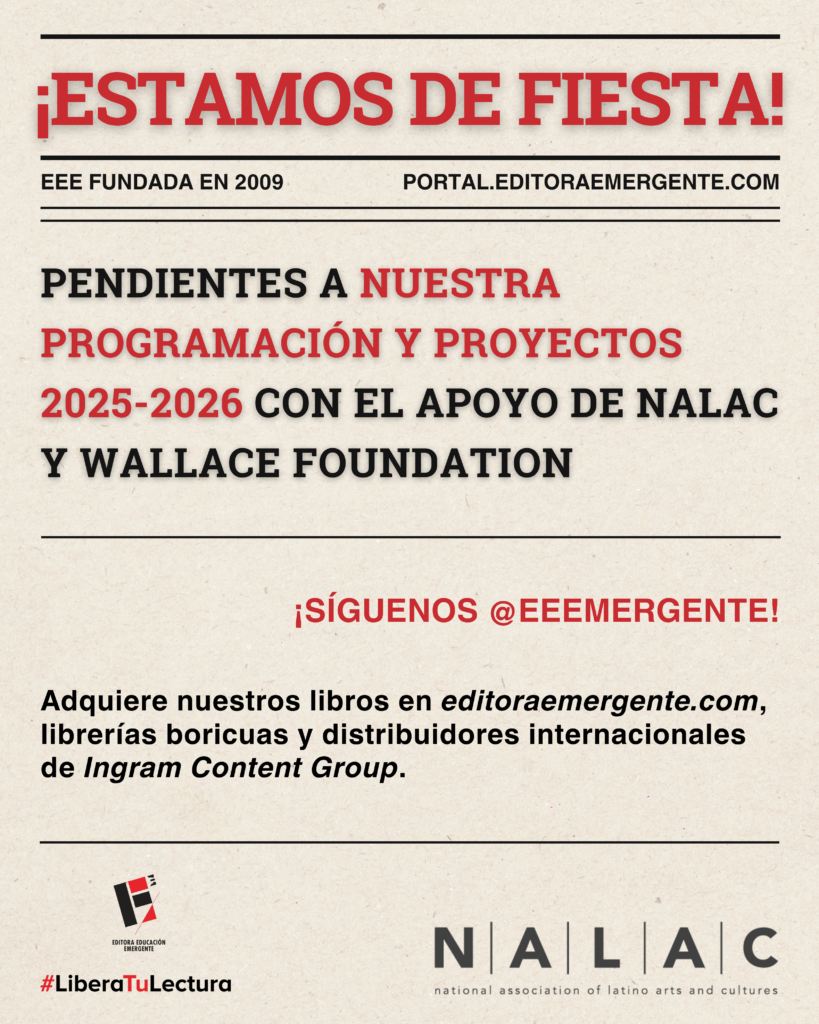 At Editora Educación Emergente (EEE) we believe in an open, inclusive, and diverse culture, nurtured by the creative and critical reciprocity that characterizes reading and writing. We are committed with inclusion in all phases of our books’ evaluation, production, and distribution process. Our meticulous editorial project embraces, celebrates, and disseminates emergent, unusual, and alternative voices, forms, contents, and methods throughout the Puerto Rican archipelago and its diasporas.